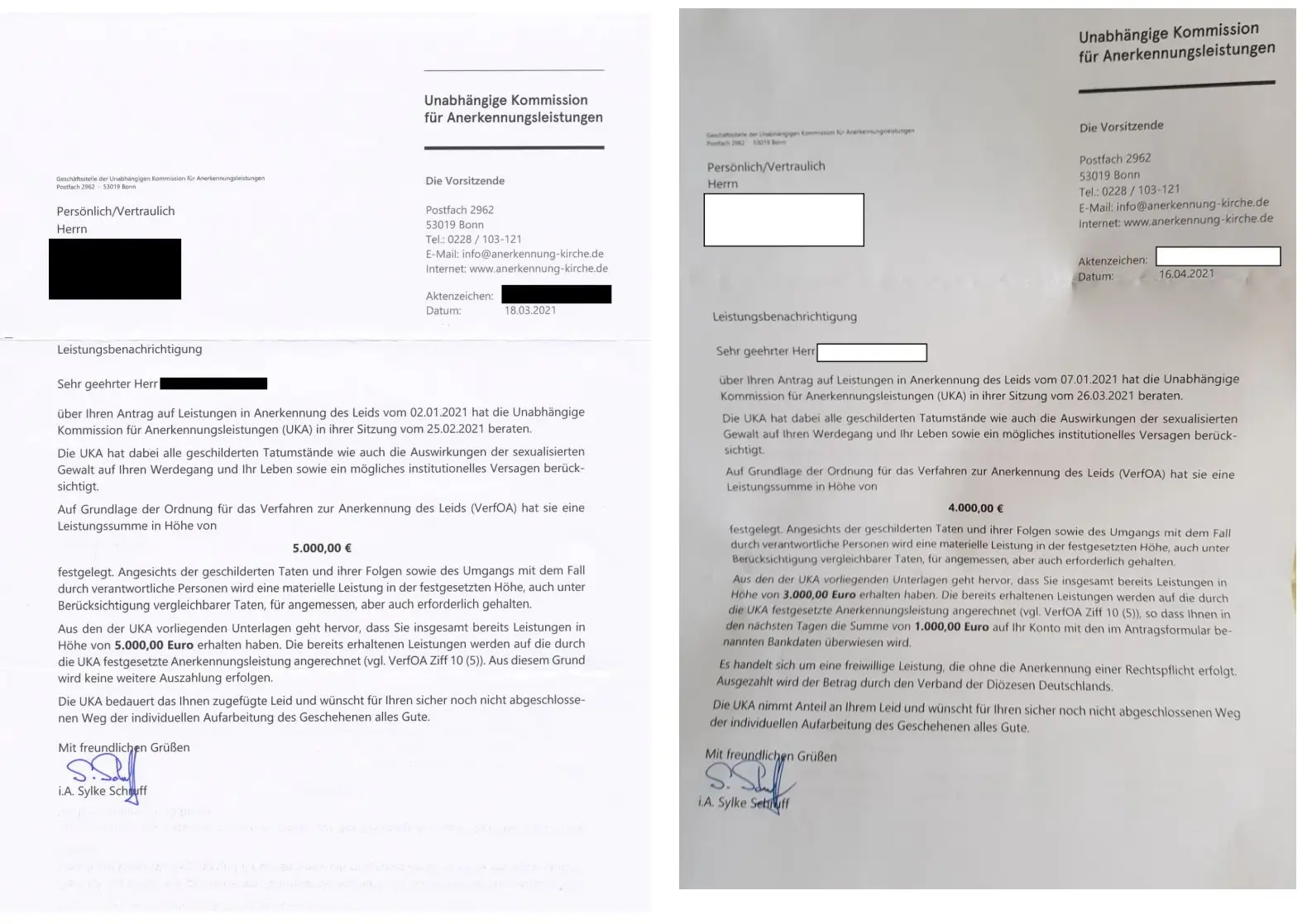Wir fordern seit 2010 Entschädigungszahlungen von der Kirche. Dazu ist die Kirche bislang nicht bereit.rnAufgrund des öffentlichen Drucks ist das von ihr entwickelte Verfahren für Zahlungen als „Anerkennung des Leids“ mehrfach aktualisiert worden.rnDerzeit steht eine grundsätzliche Anhebung der bewilligten Leistungen der UKA aus, nachdem im Sommer 2023 in einem ersten Verfahren auf Schmerzensgeld erstmals 300.000 Euro zugesprochen wurden.rnDie Kirche hat immer betont, sie würde sich in ihren UKA Entscheidungen an der oberen Grenze der Schmerzensgeld-Tabellen orientieren. Bislang scheint sie sich einer generellen Anhebung der Leistungen gegenüber aber noch zu sperren.