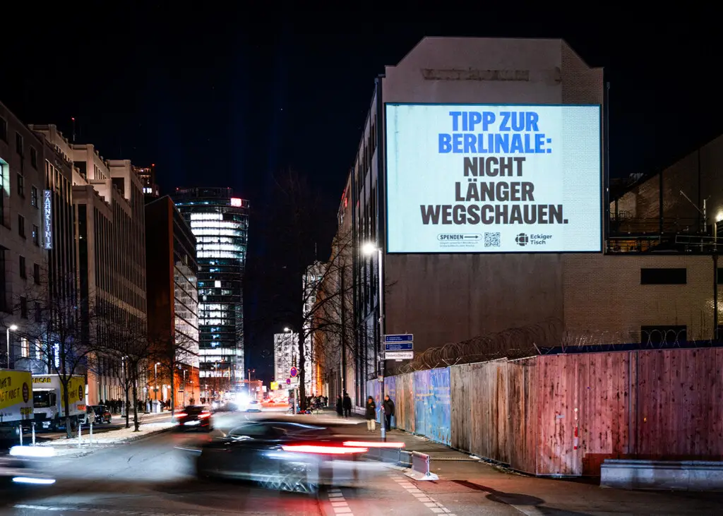 Anlässlich des Filmfestivals Berlinale haben wir in den vergangenen Tagen in Berlin verschiedene Botschaften an Gebäudeflächen rund um die Berlinale projiziert, um sichtbar zu machen, dass die Betroffenen von sexueller Gewalt immer noch auf ein Ende dieses Dramas warten.